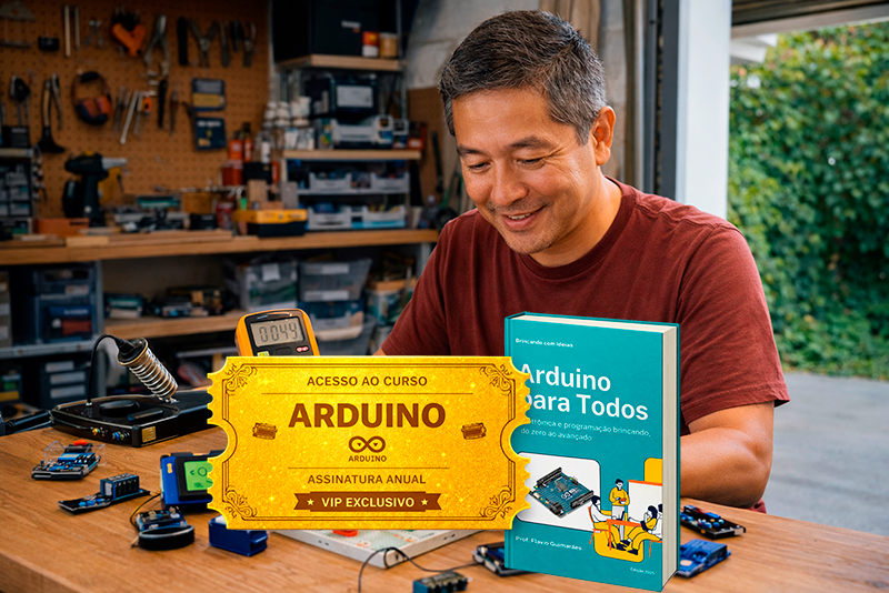 Com ela, você tem acesso ao Curso de Arduino para Hobbistas, ao Curso Arduino Avançado, a conteúdos atualizados, novos projetos e ainda recebe gratuitamente o livro Arduino para Todos (PDF) — um material didático completo para fortalecer sua base técnica.
